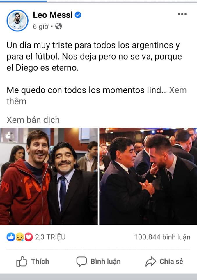 Leo Messi đau buồn: “Một ngày rất buồn cho đất nước Argentina và bóng đá. Anh ấy rời bỏ chúng ta nhưng sự thật anh không rời bỏ, bởi vì Diego là vĩnh cửu.