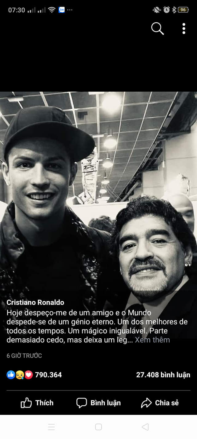 Còn Ronaldo viết: “Hôm nay tôi chia tay một người anh và thế giới chia tay một thiên tài vĩnh hằng. Một trong những ảo thuật gia tốt nhất từ trước đến giờ. Anh ra đi quá sớm nhưng để lại một di sản vô biên và một khoảng trống sẽ không bao giờ được lấp đầy. Yên nghỉ nhé anh. Anh sẽ không bao giờ bị lãng quên”.