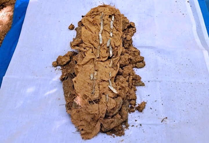 Do hài cốt bị phân hủy gần hết, trộn lẫn trong lớp đất đen, đơn vị chỉ thu được 18 mảnh xương nhỏ và lấy 2 mẫu để xét nghiệm ADN. Di vật kèm theo gồm tăng, vải dù, 1 dao găm và 1 bát B52.