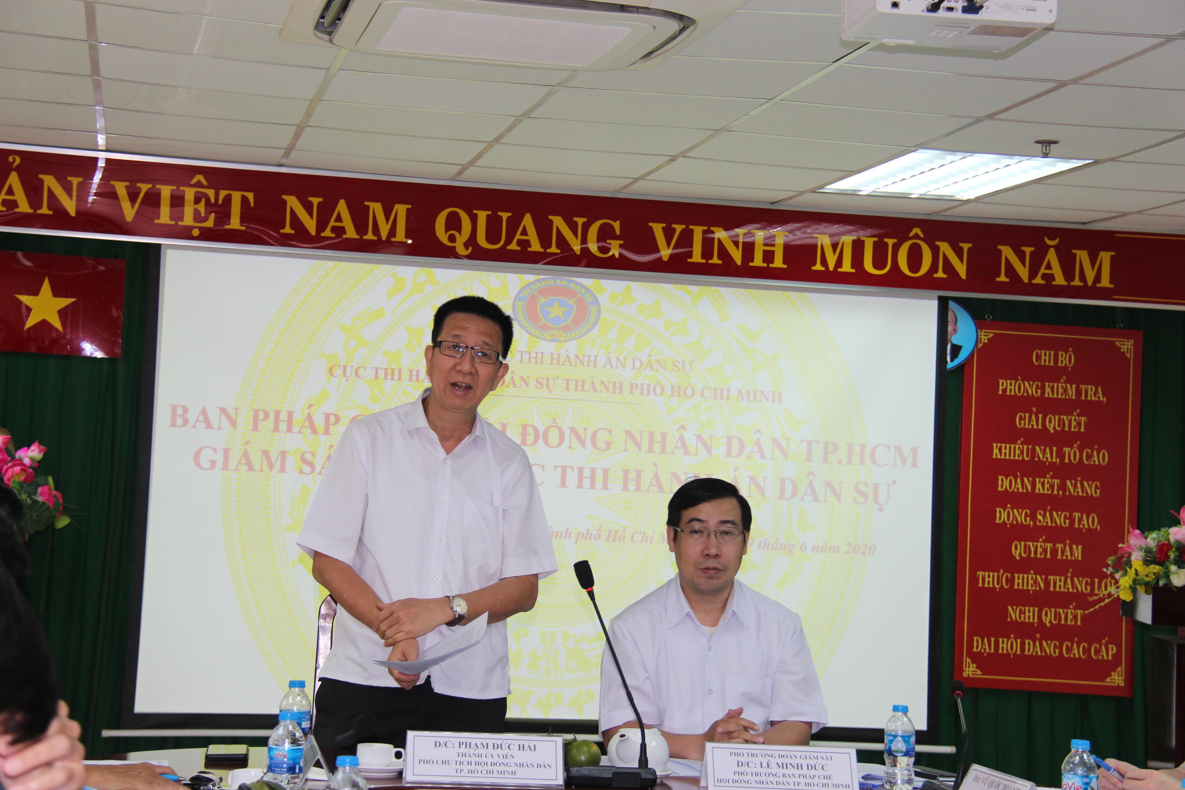 (PLVN) -Thực hiện Kế hoạch giám sát về tình hình thực hiện công tác thi hành án dân sự 06 tháng đầu năm 2020 trên địa bàn thành phố, Ban pháp chế Hội đồng nhân dân (HĐND) thành phố Hồ Chí Minh vừa có buổi giám sát công tác thi hành án dân sự. Ông Phạm Đức Hải - Phó Chủ tịch HĐND thành phố chủ trì buổi giám sát.