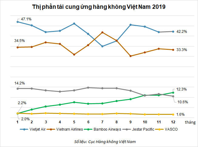 Theo đó, trong tháng 12/2019, Vietjet nắm 42,2% thị phần tải cung ứng so với mức 41,2% trong tháng 1/2019.