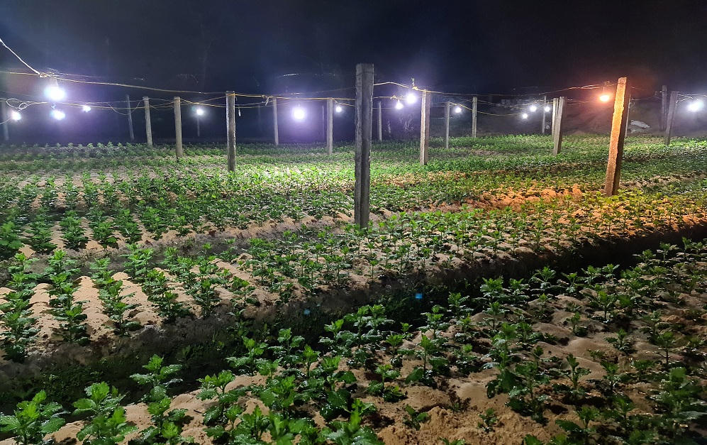 Vụ hoa Tết năm nay được bắt đầu gieo trồng muộn so với mọi năm. Tại xã Hồng Thủy (huyện Lệ Thủy), để cây hoa được thu hoạch đúng vụ, người trồng hoa không chỉ dày công chăm sóc mà còn thắp điện xuyên đêm trên vườn cúc để cho cây phát triển nhanh. Hệ thống bóng điện thắp sáng được lắp đặt với mật độ mỗi bóng cách nhau 1,5-2m, hơi nóng từ bóng điện sẽ giúp hoa cúc nhanh đẻ nhánh. Đến khoảng gần một tháng trước Tết Nguyên đán, người trồng hoa sẽ cắt điện để cúc đóng búp và tạo hoa.