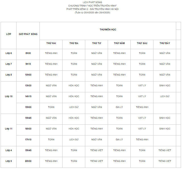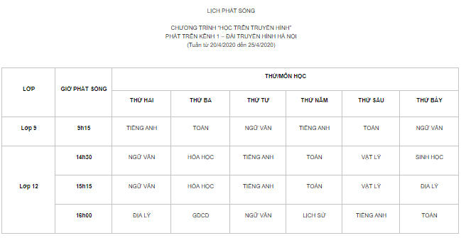 Sở Giáo dục và Đào tạo Hà Nội đã thông báo lịch phát sóng chương trình "Học trên truyền hình" cho học sinh lớp 4 đến lớp 12 trên địa bàn, từ ngày 20/4 đến 25/4.