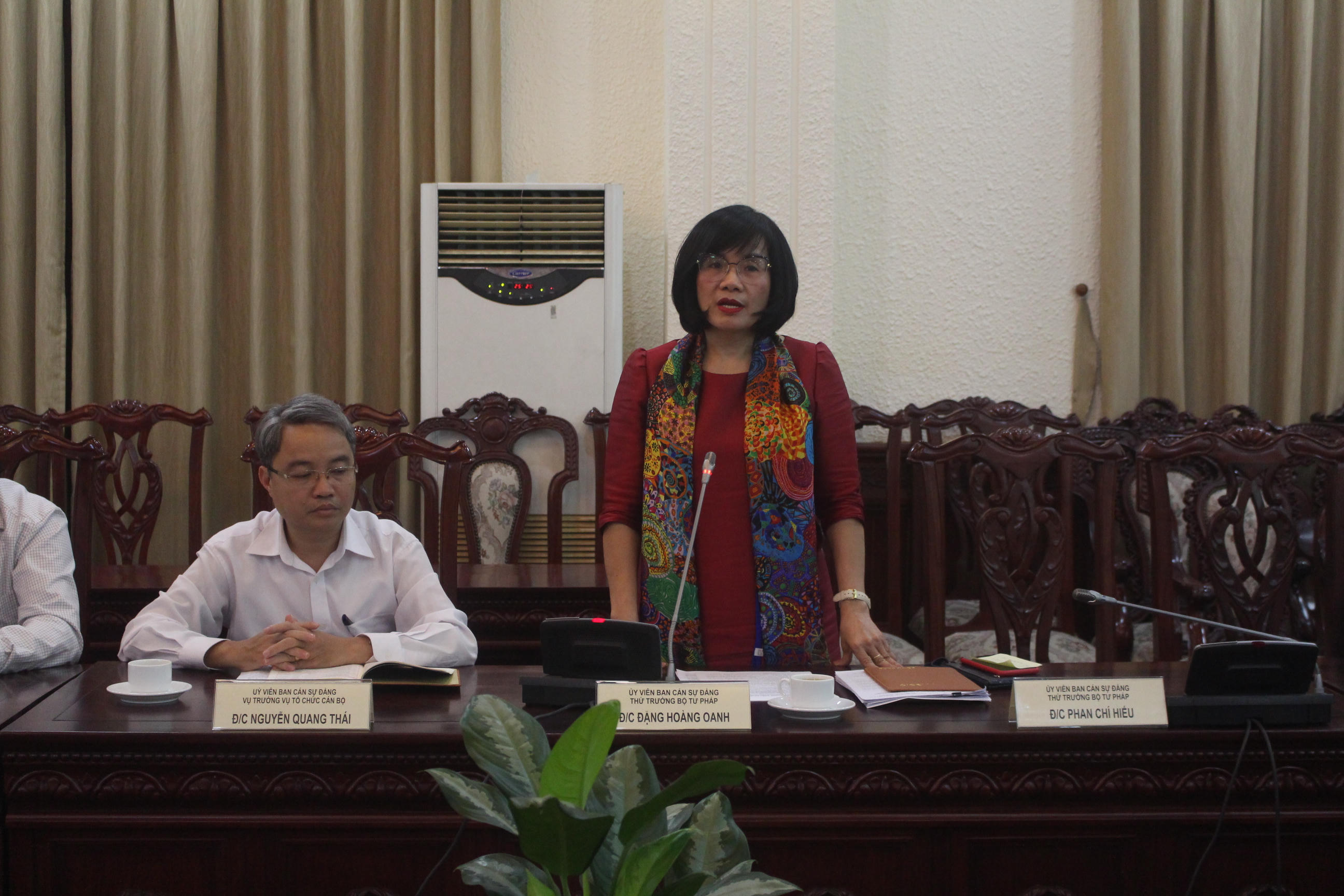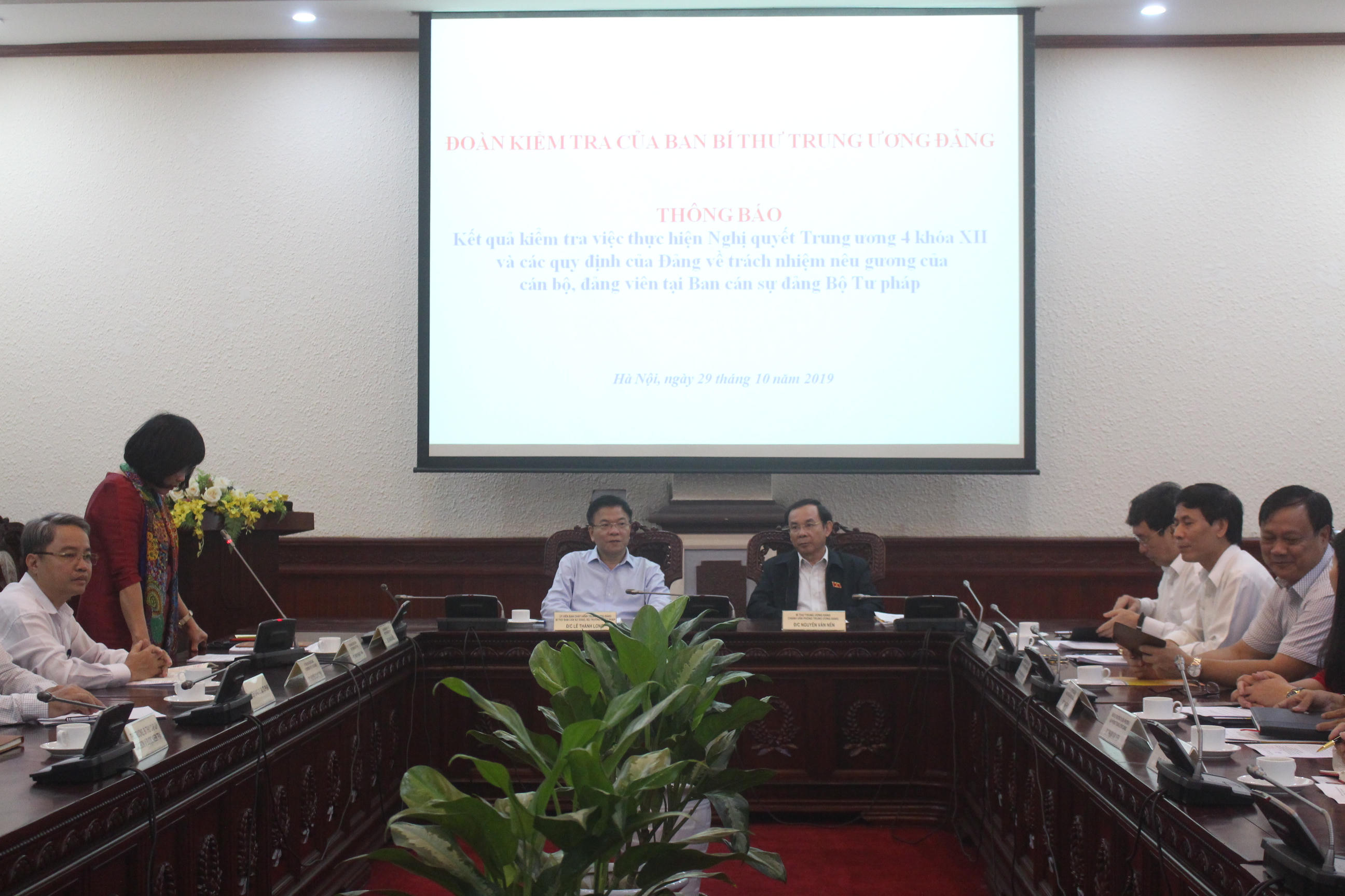 Về phía Bộ Tư pháp có Bí thư Ban Cán sự Đảng, Bộ trưởng Bộ Tư pháp Lê Thành Long; Thứ trưởng Đặng Hoàng Oanh, Phó Bí thư thường trực Đảng ủy Bộ Tư pháp Nguyễn Kim Tinh và Thủ trưởng, Bí thư cấp ủy các đảng bộ, chi bộ được kiểm tra gồm Đảng bộ Tổng cục Thi hành án dân sự, Chi bộ Cục Quản lý xử lý vi phạm hành chính và theo dõi thi hành pháp luật, Chi bộ Vụ Pháp luật quốc tế.