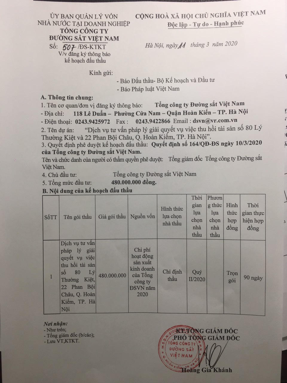 Căn cứ Quyết định số 164/QĐ-ĐS ngày 10/3/2020 của Tổng Giám đốc Tổng Công ty đường sắt Việt Nam phê duyệt Kế hoạch lựa chọn nhà thầu gói thầu “Dịch vụ tư vấn pháp lý giải quyết vụ việc thu hồi tài sản số 80 Lý Thường Kiệt, 22 Phan Bội Châu, quận Hoàn Kiếm, TP Hà Nội, Tổng Công ty đường sắt Việt Nam thông báo mời thầu như sau: