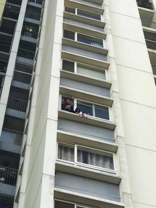 Thót tim cảnh bé gái vắt vẻo ngoài ban công tầng 6 gọi mẹ