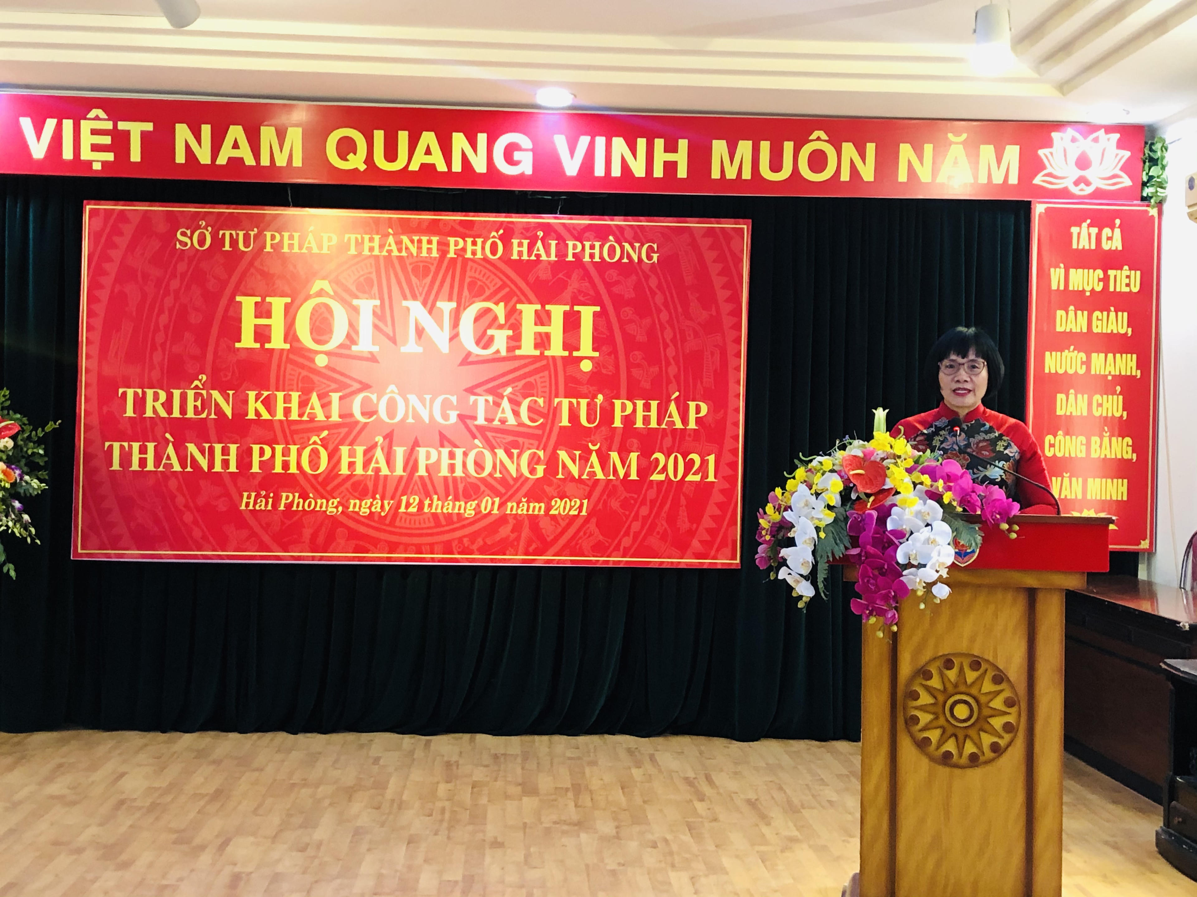 Phát biểu tại hội nghị, Thứ trưởng Bộ Tư pháp Đặng Hoàng Oanh nhấn mạnh, năm 2021 là năm diễn ra nhiều sự kiện hết sức quan trọng của đất nước như Đại hội đại biểu toàn quốc lần thứ XIII của Đảng, bầu cử đại biểu Quốc hội khoá XV và đại biểu Hội đồng nhân dân các cấp nhiệm kỳ 2021-2026 và cũng là năm đầu tiên thực hiện Chiến lược phát triển kinh tế - xã hội 10 năm 2021-2030, Kế hoạch phát triển kinh tế - xã hội 5 năm 2021-2025 với nhiều thời cơ và vận hội mới cho đất nước, cho Bộ, ngành Tư pháp cũng như đối với TP Hải Phòng.