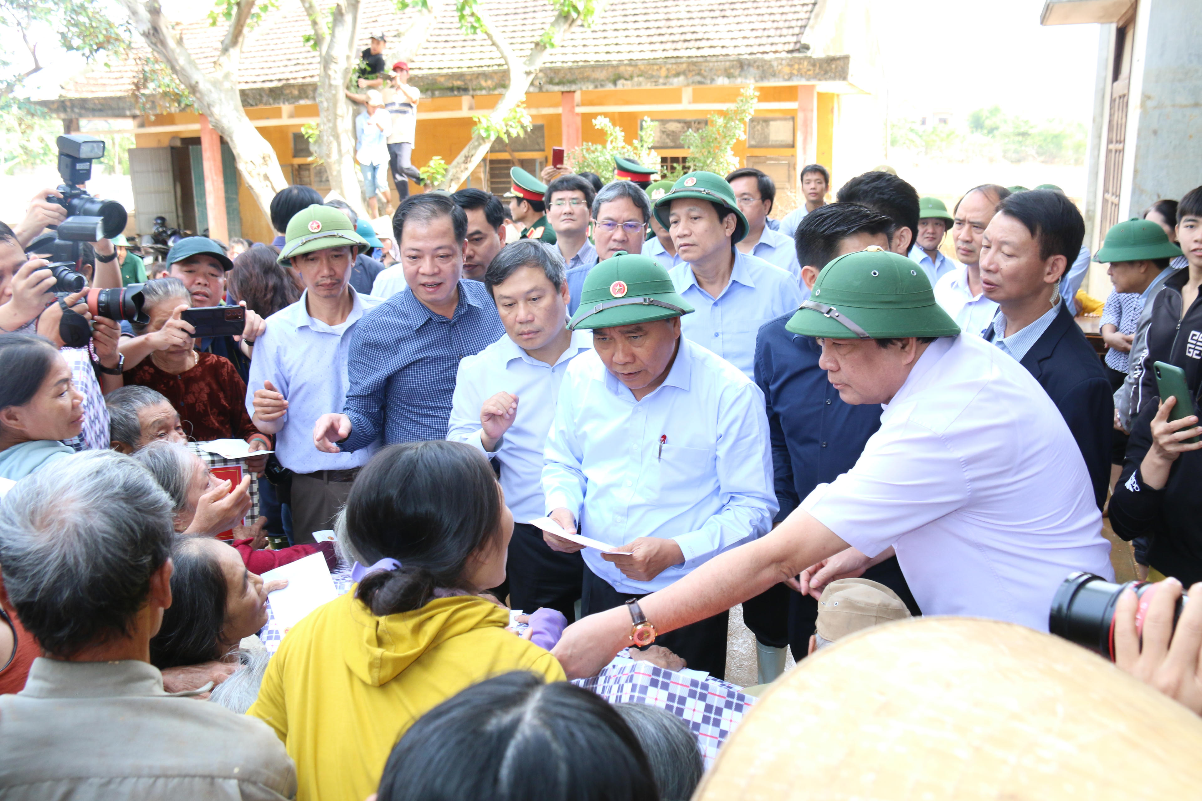 Sau khi đến Quảng Bình, Thủ tướng Chính phủ Nguyễn Xuân Phúc cùng đoàn công tác Trung ương và địa phương đã đến thăm hỏi, động viên thầy cô giáo tại trường mầm non Hiền Ninh, tặng quà cho một số hộ dân bị thiệt hại nặng trong mưa lũ vừa qua tại thôn Đồng Tư, xã Hiền Ninh, huyện Quảng Ninh.