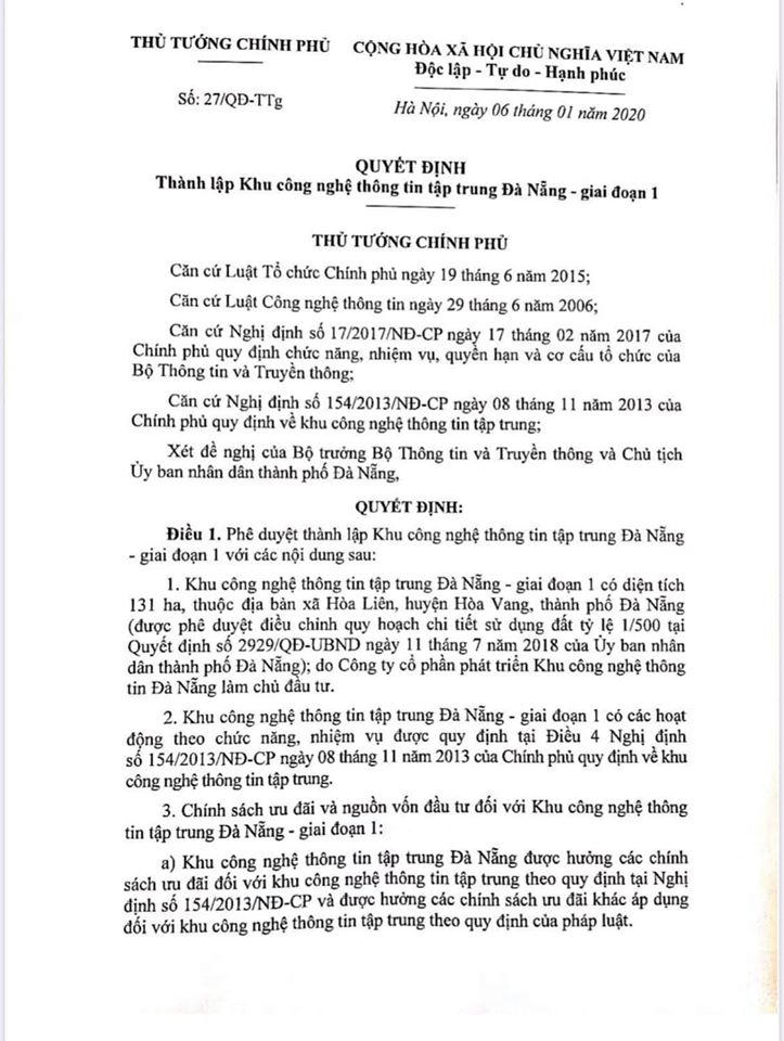 (PLVN) - Thủ tướng Chính phủ vừa ký quyết định về việc thành lập Khu công nghệ thông tin tập trung Đà Nẵng - giai đoạn 1 (Da Nang IT Park) có diện tích 131ha, thuộc địa bàn xã Hòa Liên, huyện Hòa Vang (Đà Nẵng). Dự án do Công ty Cổ phần Phát triển khu công nghệ thông tin Đà Nẵng làm chủ đầu tư được kỳ vọng sẽ trở thành “thung lũng Silicon Đà Nẵng”.