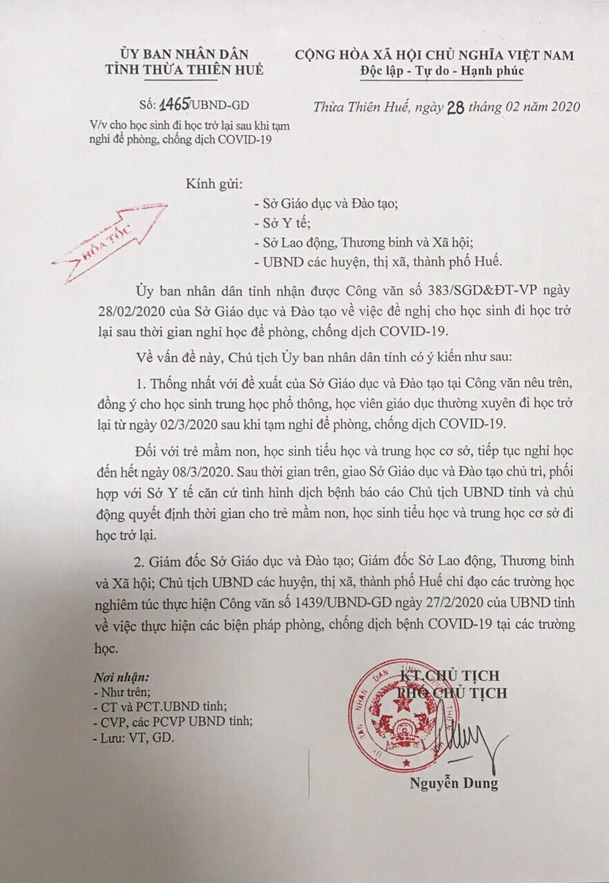 Theo đó, tỉnh TT- Huế đồng ý với đề xuất của Sở Giáo dục và Đào tạo cho phép trẻ mầm non, học sinh tiểu học, trung học cơ sở tiếp tục nghỉ học từ ngày 02/3 đến hết ngày 08/3/2020. Sau thời gian nghỉ trên, giao Sở Giáo dục và Đào tạo chủ trì, phối hợp với Sở Y tế căn cứ tình hình dịch bệnh báo cáo Chủ tịch UBND tỉnh và chủ động quyết định thời gian cho trẻ mầm non, học sinh tiều học và trung học cơ sở đi học trở lại.