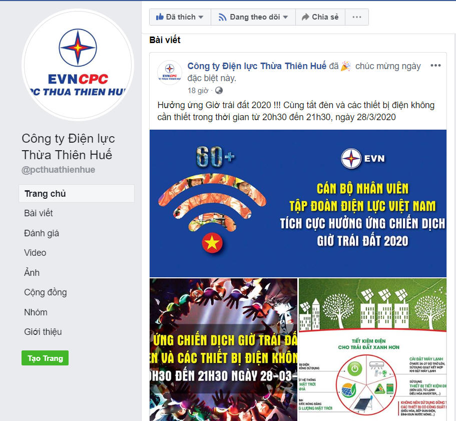 Với vai trò là đơn vị đảm bảo cung ứng điện trên địa bàn, Công ty Điện lực Thừa Thiên Huế đã xây dựng chương trình hưởng ứng sự kiện Giờ Trái đất với nhiều hành động thiết thực, như: Tắt đèn chiếu sáng và các thiết bị điện không cần thiết tại khu vực văn phòng và các đơn vị Điện lực trong 05 ngày liên tục trước sự kiện. Phát động chiến dịch, vận động toàn thể CBCNV tắt đèn và các thiết bị điện không cần thiết vào thời gian diễn ra sự kiện Tắt đèn hưởng ứng Giờ Trái đất. Đăng tải nội dung tuyên truyền hưởng ứng Giờ Trái đất 2020 trên website, fanpage mạng xã hội Facebook, Zalo. Phát video tuyên truyền trên màn hình vô tuyến ở phòng giao dịch khách hàng, màn hình LED tại văn phòng Công ty, không sử dụng băng rôn và sản phẩm nhựa 01 lần để tuyên truyền,…