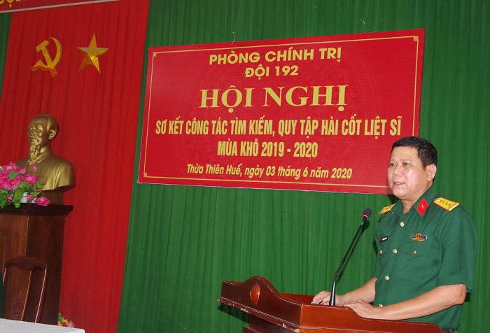 (PLVN) - Ngày 3/6, Đội quy tập mộ liệt sĩ 192, Bộ Chỉ huy quân sự tỉnh Thừa Thiên Huế tổ chức Hội nghị sơ kết công tác tìm kiếm, quy tập hài cốt liệt sĩ mùa khô 2019 - 2020. Đại tá Hoàng Văn Nhân, Chính ủy Bộ CHQS tỉnh đến dự và chỉ đạo hội nghị.