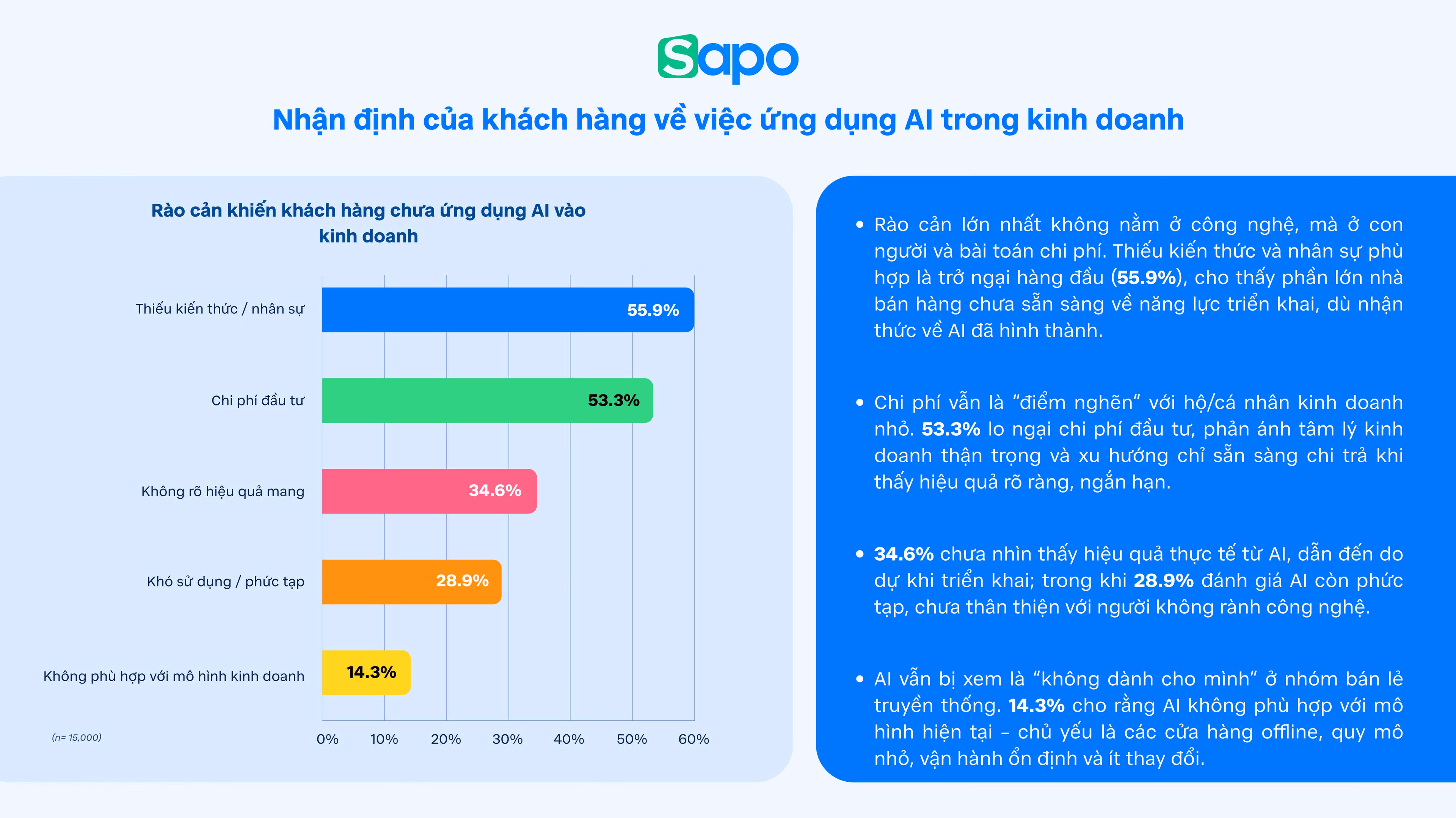 Dù có cái nhìn tích cực về vai trò của AI, phần lớn nhà bán hàng vẫn chưa sẵn sàng triển khai rộng rãi. Những rào cản chính bao gồm thiếu kiến thức hoặc nhân sự phù hợp (55,9%), chi phí đầu tư (53,3%) và việc chưa nhìn thấy hiệu quả rõ ràng (34,6%). Điều này cho thấy AI đang ở giai đoạn “được kỳ vọng cao nhưng cần chứng minh giá trị thực tế”, đặc biệt đối với các mô hình kinh doanh nhỏ và vừa.