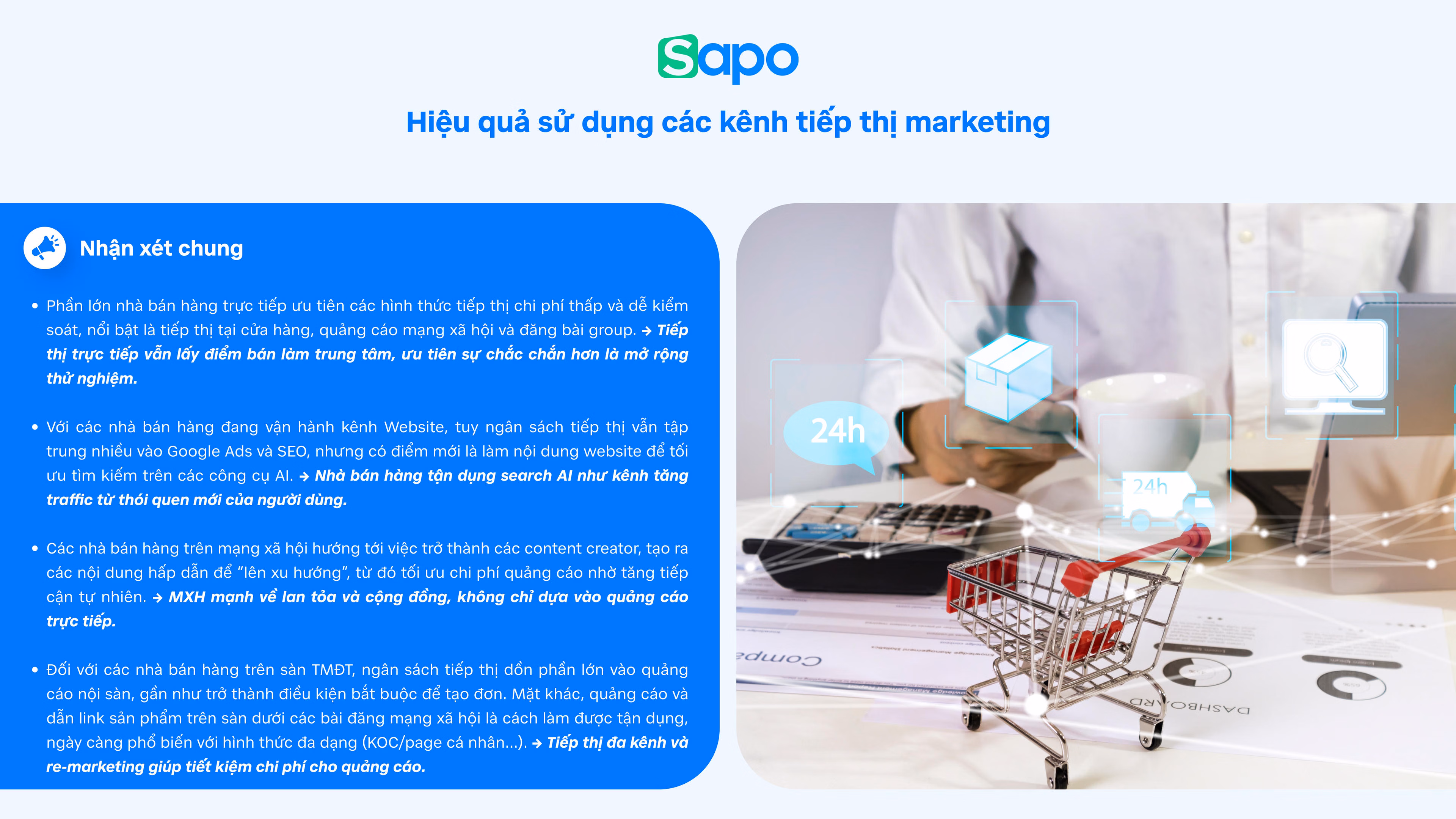 Khi đánh giá về hiệu quả bán hàng, đặc biệt ở khả năng tạo đơn nhanh và mở rộng tệp khách hàng, các kênh trực tuyến lại nổi bật rõ rệt. Có tới 44% nhà bán hàng cho rằng mạng xã hội và sàn thương mại điện tử là kênh hiệu quả nhất, trong đó sàn TMĐT chiếm 28,5% và mạng xã hội chiếm 15,5%. Điều này cho thấy với các nhà bán hàng đa kênh, động lực tăng trưởng và kỳ vọng hiệu quả của nhà bán hàng đang dịch chuyển mạnh sang các kênh online.
