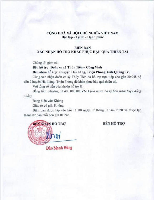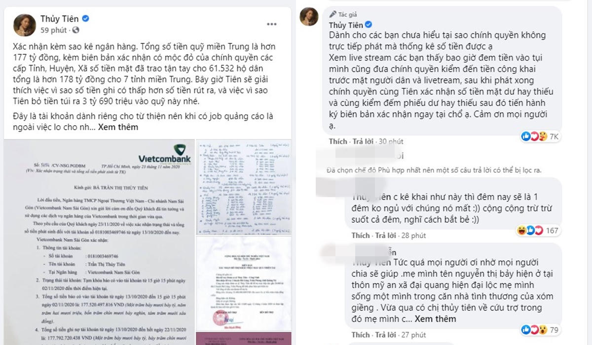 Tối 23/11, Facebook ca sĩ Thủy Tiên đã đăng bài viết dài thống kê chi tiết số tiền người dân thông qua cô để gửi tới đồng bào miền Trung qua sao kê ngân hàng và số tiền thực tế mà cô đã gửi tới người dân, kèm biên bản xác nhận có mộc đỏ của chính quyền các cấp tỉnh, huyện, xã.