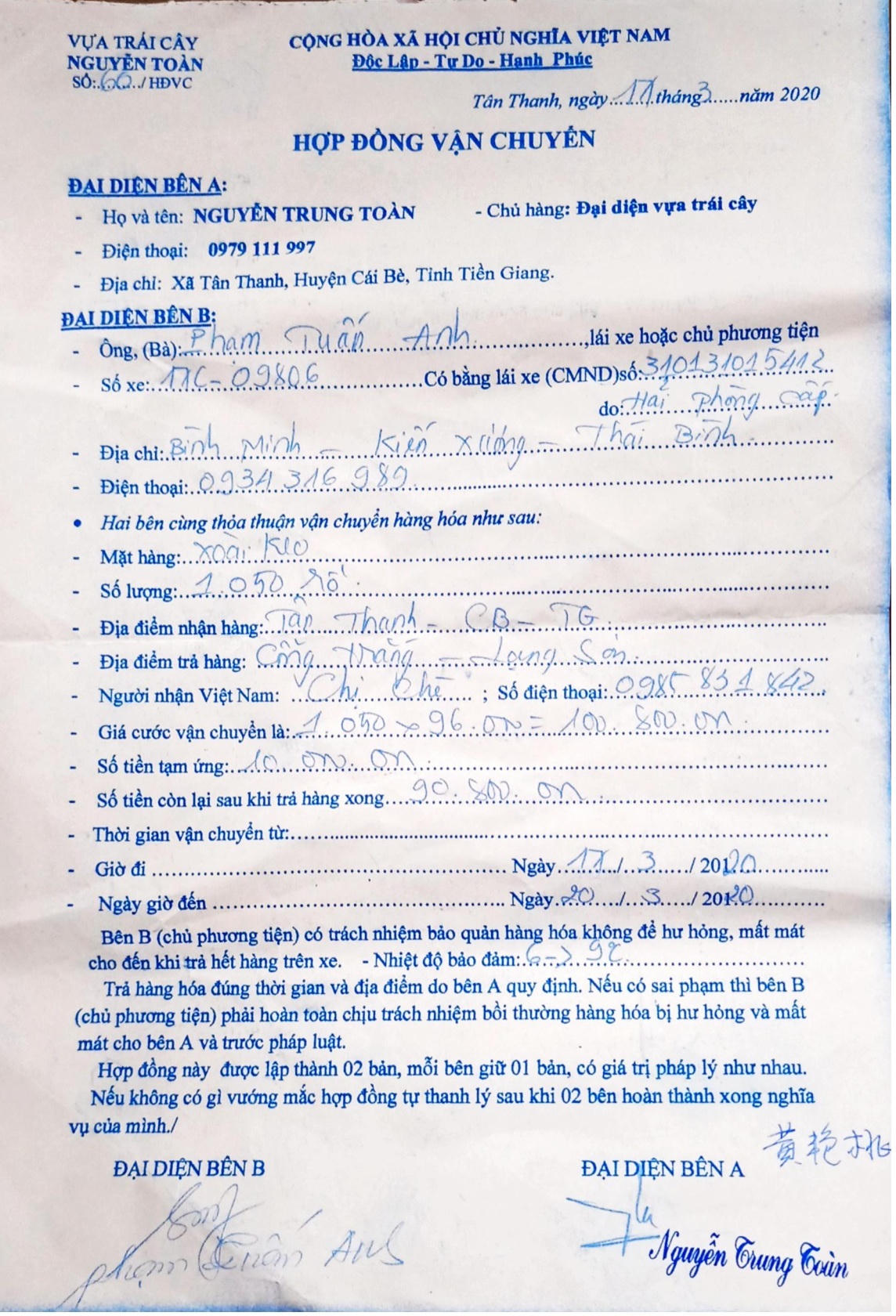 Theo phản ánh của tài xế Phạm Tuấn Anh (ngụ tại xã Bình Minh, huyện Kiến Xương, tỉnh Thái Bình), chủ xe BKS 17C-098.06 phản ánh, ngày 17/3/2020 anh có ký hợp đồng vận chuyển số 60/HĐVC với Vựa trái cây Nguyễn Toàn. Mặt hàng vận chuyển là xoài keo, số lượng 1.050 rổ từ xã Tân Thanh (huyện Cái Bè, Tiền Giang) tới Cổng Trắng (tỉnh Lạng Sơn). Tổng số tiền cước vận chuyển theo hợp đồng là 100.800.000 đồng.