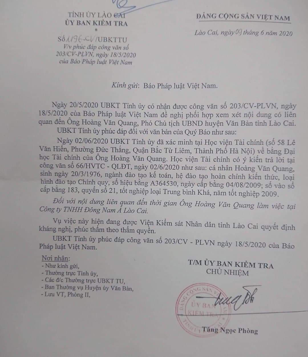 Để trả lời cho những bất thường nêu trên, gần đây, theo nguồn tin của PLVN, Ủy ban Kiểm tra Tỉnh uỷ Lào Cai đã có báo cáo xem xét nội dung do Báo Pháp luật Việt Nam nêu nhưng thể hiện nhiều nội dung rất... lạ.