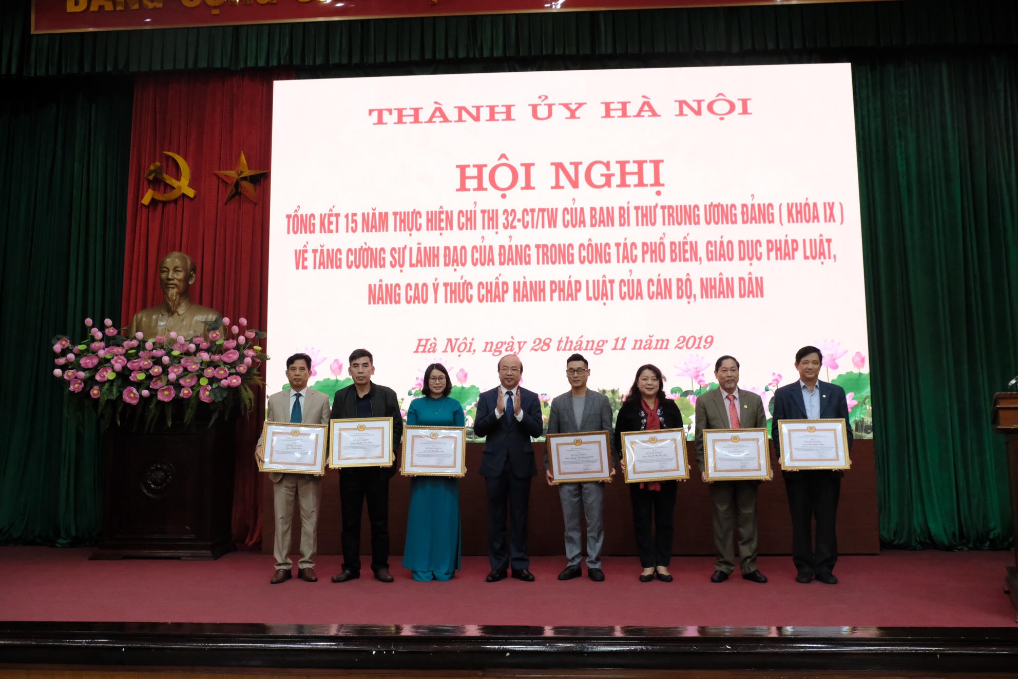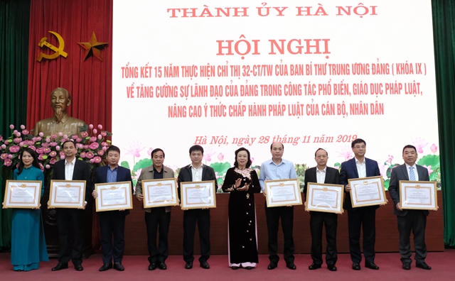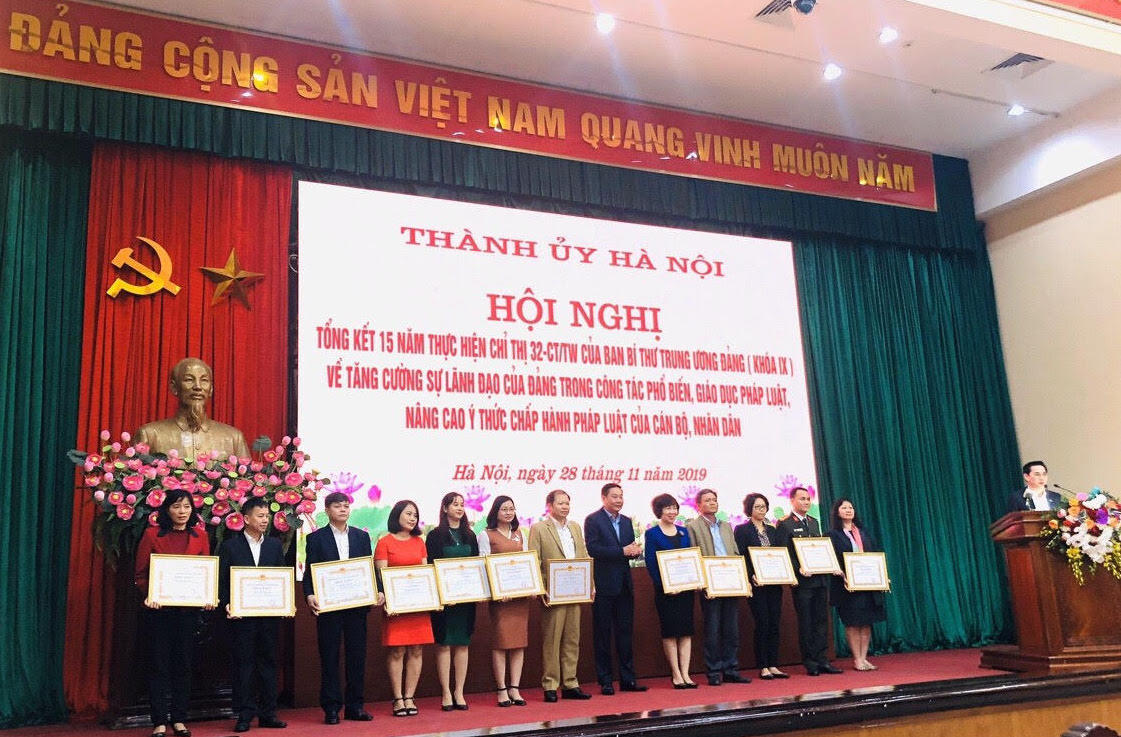 Ngày 28/11, Thành ủy Hà Nội tổ chức Hội nghị tổng kết 15 năm thực hiện Chỉ thị 32-CT/TW ngày 9/12/2003 của Ban Bí thư Trung ương Đảng (khóa IX) về “Tăng cường sự lãnh đạo của Đảng trong công tác PBGDPL, nâng cao ý thức chấp hành pháp luật của cán bộ, nhân dân”.
