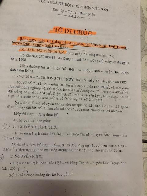 Ông Nguyễn Doãn, lập một tờ di chúc, được UBND xã Hiệp Thạnh-Đức Trọng-Lâm Đồng chứng thực tờ di chúc này. Sau đó, chính ông hay ai? ông Doãn, hay ai? không hủy tờ di chúc, ông Doãn lại ký hợp đồng cho tặng kiểu, thích ai thì cho! Ông Doãn phân thửa đất đã di chúc làm nhiều phần nhỏ khác nhau rồi cho, tặng nhiều người khác nhau. Chính quyền sở tại tỉnh Lâm Đồng đã chứng thực vào hợp đồng cho tặng này...