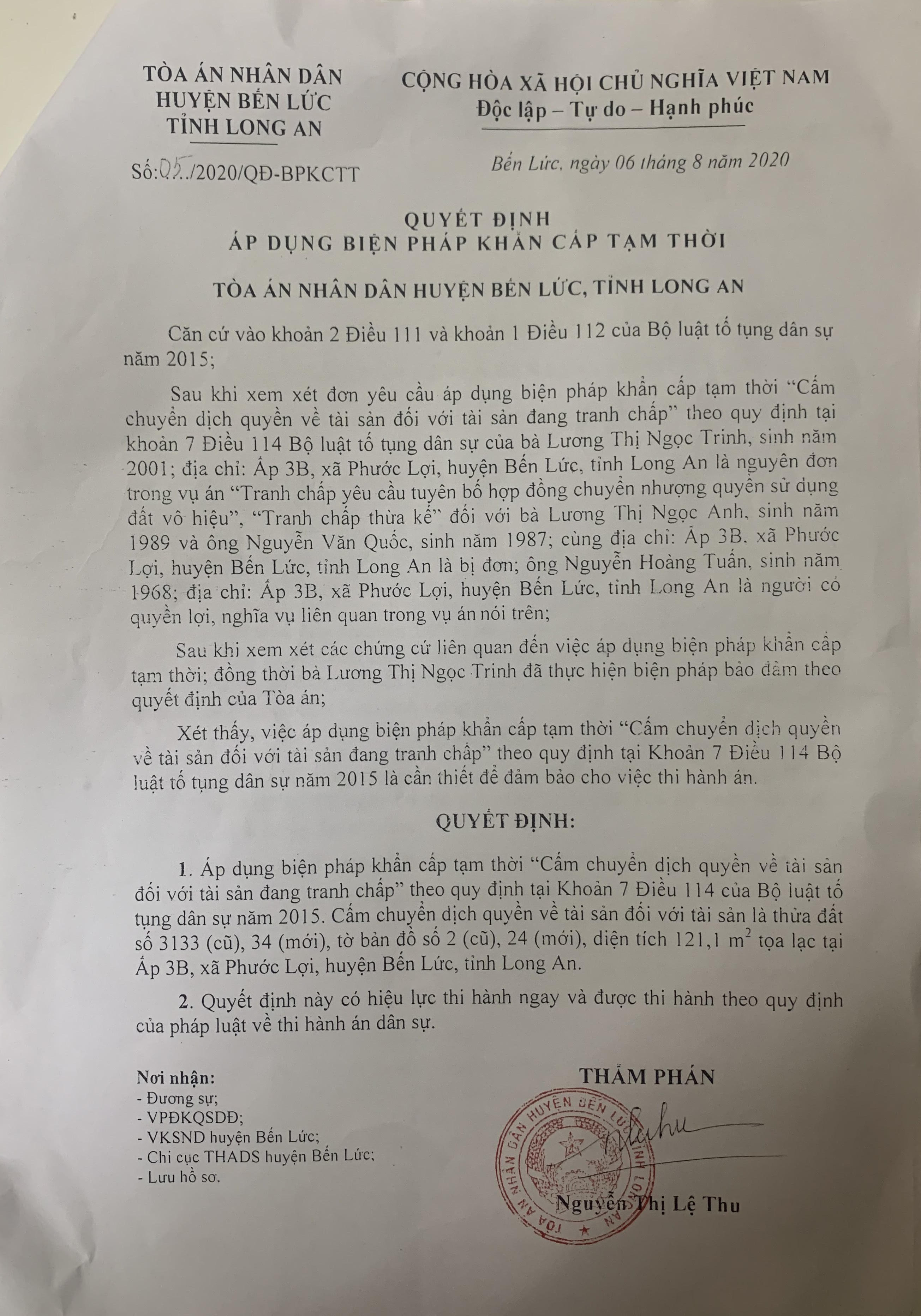 Đến ngày 6/8/2020, TAND huyện Bến Lức chính thức có quyết định áp dụng biện pháp khẩn cấp tạm thời “Cấm chuyển dịch quyền về tài sản đối với tài sản đang tranh chấp” đối với thửa đất số 3133 (hiện nay là thửa 34), tờ bản đồ số 2 (hiện nay là 24) diện tích 121,1 m2 (ấp 3B, xã Phước Lợi) – nơi cả 3 chị em bà Anh, Huyền, Trinh cùng các thành viên khác trong gia đình đang sinh sống.
