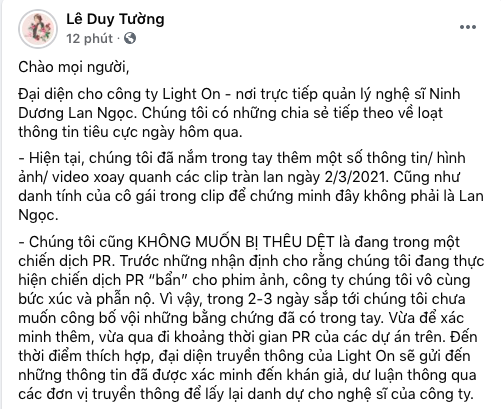 Đến ngày 3/3, đại diện Ninh Dương Lan Ngọc đã chính thức có chia sẻ dài trên trang cá nhân và khẳng định đã tìm được cô gái trong clip kia. Đại diện của nữ diễn viên cho biết đã có thêm thông tin về những đoạn clip, hình ảnh được chia sẻ vào ngày 2/3. Tuy nhiên, vì không muốn bị netizen cho rằng Ninh Dương Lan Ngọc đang sử dụng chiêu "PR bẩn" nên ekip sẽ giữ im lặng và công bố những thông tin đó đến khán giả vào 2-3 ngày sau.