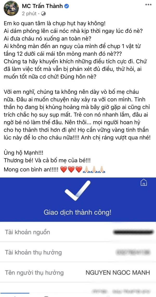 MC Trấn Thành bày tỏ sự cảm kích và mong mọi người hãy khuyến khích điều tích cực đừng phán xét đủ điều nữa: "Em không quan tâm là chụp hụt hay không. Ai dám phóng lên cái nóc nhà kịp thời ngay lúc đó nè? Ai đưa cháu nó xuống an toàn nè? Ai không màn đến an nguy của mình để chụp 1 vật từ tầng 12 dưới cái mái tôn mỏng manh đó nè?