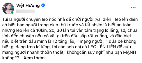 Việt Hương cho biết mình từng leo trèo trên phim trường nhiều lần để phục vụ vai diễn và rất run sợ. Dù leo vài chục lần và có cả ê-kíp lo lắng sự an toàn bên dưới thì cô vẫn hồi hộp. Nữ nghệ sĩ hỏi khó: "Nếu có vật gì trên đầu sắp rớt xuống, và đặc biệt nếu biết trên đầu mình là 12 tầng lầu, 1 mạng người, 1 đứa bé không biết gì đang treo lơ lửng, thì các anh chị có leo lên liền để cứu mạng người nhanh thoăn thoắt, không cần suy nghĩ như bạn Mạnh không? Nên họ đã leo lên là thân này coi như bỏ miễn cứu được bé, vậy là anh hùng trong lòng tui rồi nha".