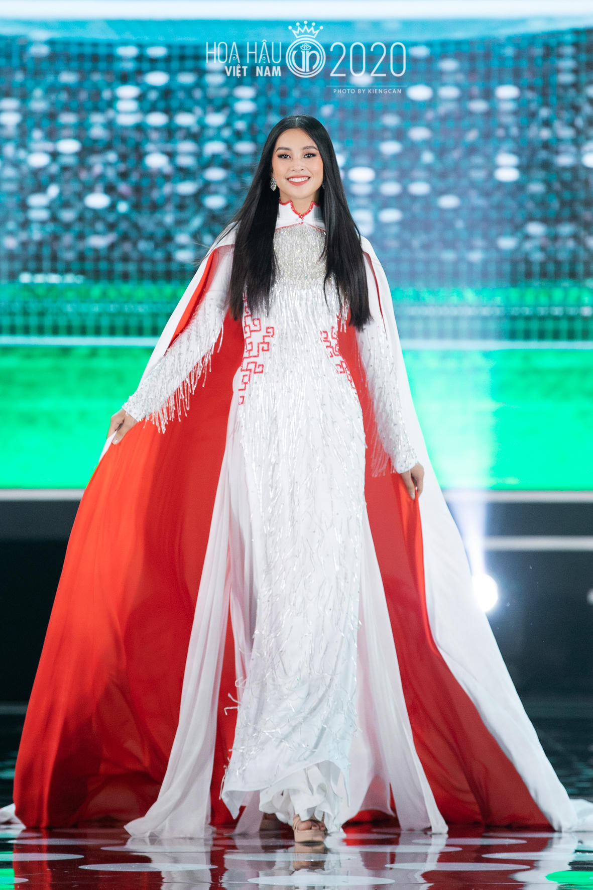 Trong đêm, Tiểu Vy trình diễn áo dài cùng Top 35 thí sinh.