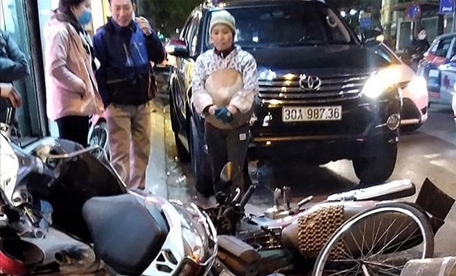 Khoảng 18h40, người dân lưu thông trên phố Thái Thịnh (quận Đống Đa, Hà Nội) hoảng hốt khi chứng kiến chiếc xe ô tô Toyota Fortuner màu đen, BKS 30A-987.36 do người phụ nữ điều khiển đã đâm vào một xe máy đang đi cùng chiều.