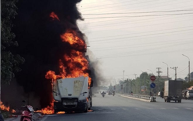Khi đến Km65+700 trên Quốc lộ 18 thì chiếc xe bất ngờ bốc cháy dữ dội, anh Tiến may mắn thoát được ra ngoài. Đầu chiếc xe container bị cháy hoàn toàn.