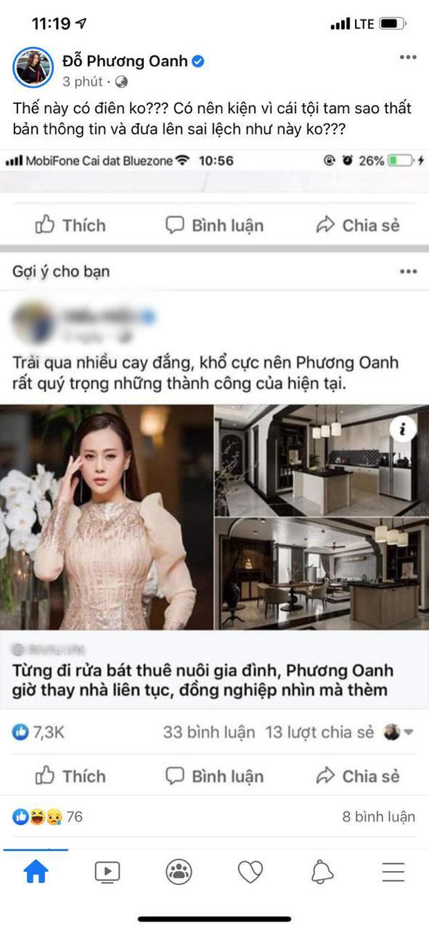 Mới đây nhất, Phương Oanh bày tỏ sự bức xúc trên trang Facebook cá nhân khi bị sử dụng hình ảnh để câu view một cách ác ý, đáng lên án. Theo đó, một số trang tin bất ngờ tung tin: "Từng đi rửa bát thuê nuôi gia đình, Phương Oanh thay nhà liên tục, đồng nghiệp nhìn mà thèm". Nữ diễn viên bức xúc lên tiếng: "Thế này có điên không? Có nên kiện vì cái tội tam sao thất bản thông tin và đưa lên sai lệch như này không?"