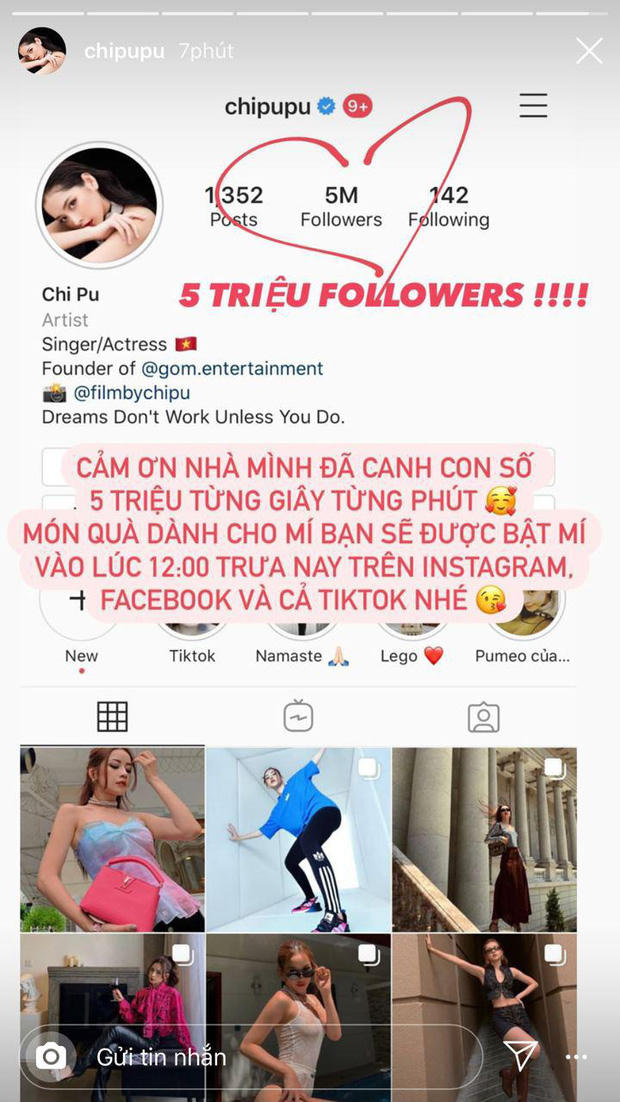 Cách đây ít phút, Chi Pu đã hào hứng thông báo tài khoản Instagram cá nhân vừa chạm mốc 5 triệu người theo dõi. Như vậy, sau Sơn Tùng M-TP, Chi Pu trở thành nghệ sĩ Việt thứ 2 đạt được thành tích "khủng" này. Nữ ca sĩ chia sẻ: "Cảm ơn cả nhà, canh con số 5 triệu từng giây từng phút".