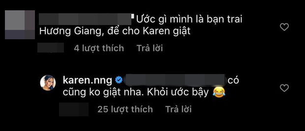 Mới đây nhất, Karen Nguyễn đã có phản ứng khá "gắt" sau khoảng thời gian im lặng khi liên tục bị lôi vào chuyện tình cảm của Hương Giang. Cụ thể, trong một bài đăng đã xuất hiện bình luận: "Ước gì mình là bạn trai Hương Giang để cho Karen giật". Ngay lập tức, nữ diễn viên đã có màn đáp trả đầy thẳng thắn: "Có cũng không giật nha. Khỏi ước bậy".