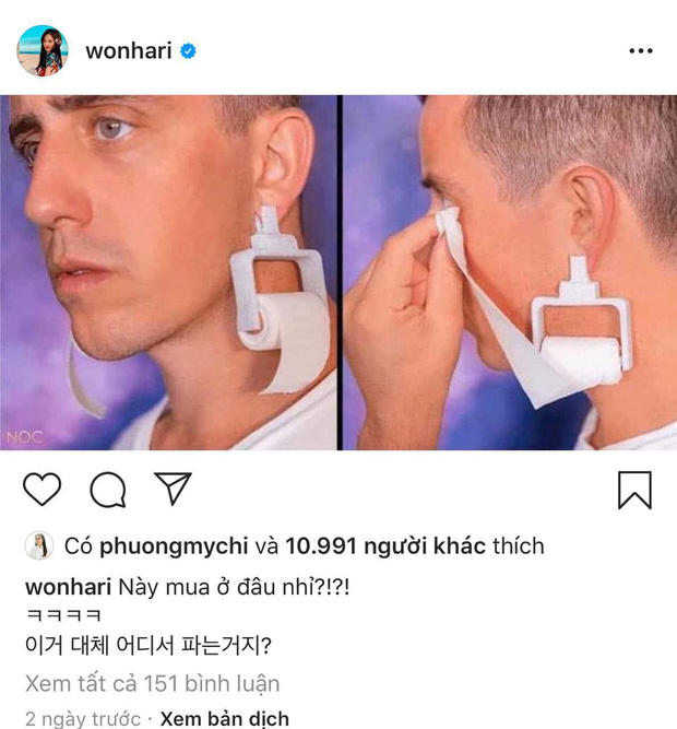 Trong khi chồng phải lên tiếng giải thích chuyện hay khóc khi dẫn chương trình, Hari Won lại gây chú ý khi có pha cà khịa Trấn Thành. Cụ thể, Hari Won đã hài hước đăng tải ảnh 1 đôi bông tai có thiết kế độc đáo là cuộn khăn giấy, người đeo có thể dùng nó để lau nước mắt. Thậm chí, Hari Won dường như có ý định mua để tặng cho chồng. Cô nàng đính kèm dòng chú thích "Này mua ở đâu nhỉ?".