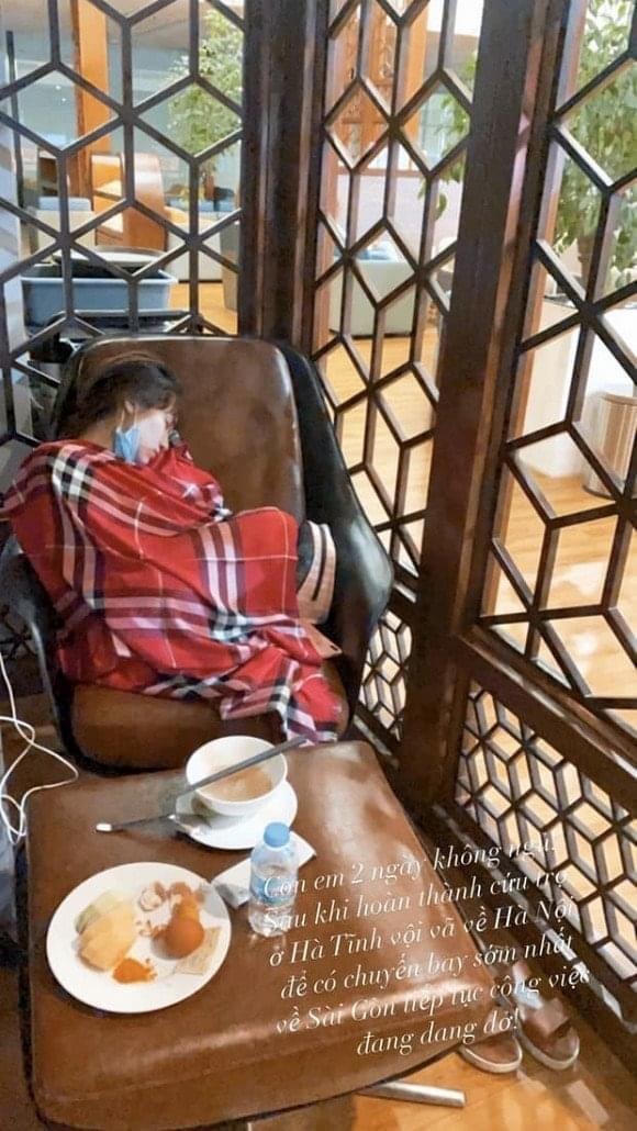 Sau hai đêm thức trắng, Hòa Minzy "ngủ gục" trên ghế ở một khách sạn. Hình ảnh nam quản lý của nữ ca sĩ vừa tiết lộ khiến nhiều người không khỏi xúc động. "Con em hai ngày không ngủ, sau khi hoàn thành cứu trợ ở Hà Tĩnh vội vã đến Hà Nội để có chuyến bay sớm nhất về Sài Gòn tiếp tục công việc dang dở", người này chia sẻ.