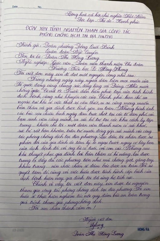 Trước đó, lá thư xin được góp sức tại chốt kiểm soát dịch bệnh Covid-19 của chị Đoàn Thị Hồng Lương, giáo viên Trường Tiểu học Lê Hồng Phong cũng đã khiến nhiều người dân Hải Phòng nói riêng và người dân các tỉnh, thành khác nói chung thật sự xúc động. “Thư xin ra trận” được viết nắn nót bằng bút mực, nét chữ đẹp và đều tăm tắp.