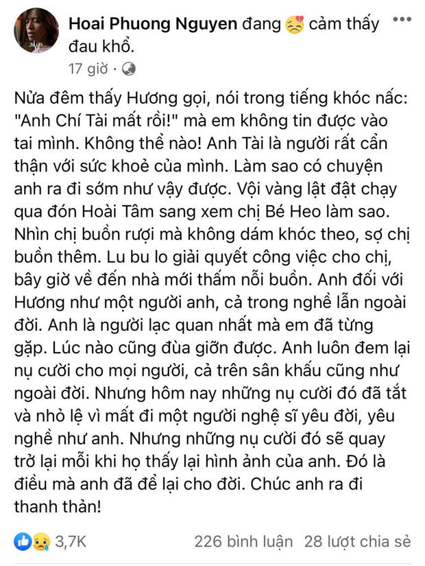 "Nghe Việt Hương báo: 'Anh Chí Tài mất rồi', tôi không tin vào tai mình. Tôi vội vàng lật đật chạy qua đón Hoài Tâm sang xem chị Bé Heo (vợ cố nghệ sĩ Chí Tài) làm sao. Nhìn chị buồn rượi mà không dám khóc theo, sợ chị buồn thêm", chồng NS Việt Hương viết trên trang cá nhân và cho biết thêm, anh đã cùng bạn bè sắp xếp công việc, giấy tờ để đón cố NS Chí Tài sang Mỹ tổ chức tang lễ trong 3-4 ngày tới.