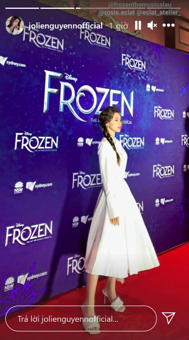 Cô đã có mặt tại buổi công chiếu vở nhạc kịch Frozen được diễn ra tại Úc. Jolie Nguyễn diện thiết kế khá kín đáo nhưng không kém phần sang trọng, khoe khéo vóc dáng thon gọn. Động thái này đã khiến nhiều người cho rằng, nàng hậu đã sẵn sàng để trở lại hoạt động showbiz.