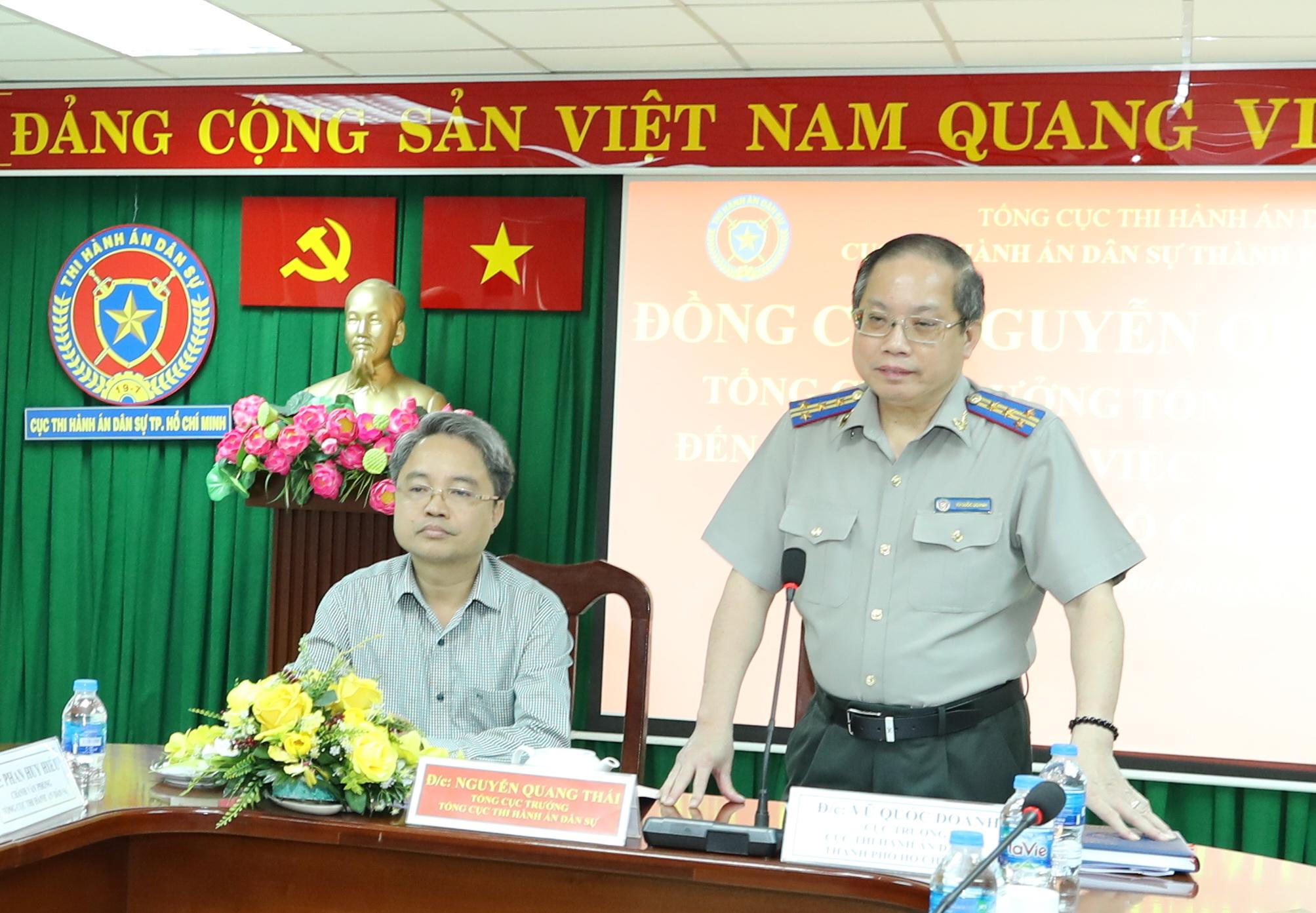 Tại buổi làm việc Cục trưởng, Cục THADS thành phố Vũ Quốc Doanh đã báo cáo kết quả công tác THADS, hành chính 09 tháng năm 2010, Kết quả thi hành một số vụ việc tham nhũng, kinh tế lớn thuộc diện Ban chỉ đạo Trung ương về phòng, chống tham nhũng theo dõi, chỉ đạo. Theo đó 09 tháng đầu năm 2020, Toàn thành phố đã thụ lý 90.288 việc với tổng số tiền trên 106.793.126.343.921 đồng; trong số có điều kiện thi hành án đã thi hành xong 37.857 việc, với 19.277.166.028.182 đồng đạt 58,21% về việc (so với chỉ tiêu được giao 80%/năm về việc thì toàn thành phố còn thiếu 1,79% để đạt chỉ tiêu kế hoạch); Về giá trị đạt 29,27% (so với chỉ tiêu được giao là 38%/năm về tiền thì toàn thành phố vượt 0,77% chỉ tiêu kế hoạch). Trong đó: Các đơn vị đạt 02 chỉ tiêu: 05 (Phòng Nghiệp vụ 2, Chi cục THADS Quận 7, 9, 10 và Nhà Bè); Đạt 01 chỉ tiêu về việc: 02; Đạt một chỉ tiêu về tiền: 13; Không đạt cả hai chỉ tiêu: 07 (Chi cục THADS Quận 2,3,11,12, Gò Vấp, Cần Giờ).