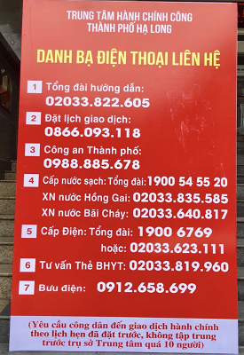 TP Hạ Long cũng khuyến khích công dân tăng cường thực hiện hành chính công trực tuyến, nộp và nhận kết quả bằng Bưu chính công ích. Đặc biệt, những trường hợp có giao dịch cần thiết, cấp bách, phải giải quyết gấp, công dân gọi điện đến số điện thoại đường dây nóng để được hướng dẫn xử lý kịp thời hoặc đăng ký lịch giao dịch trực tiếp.