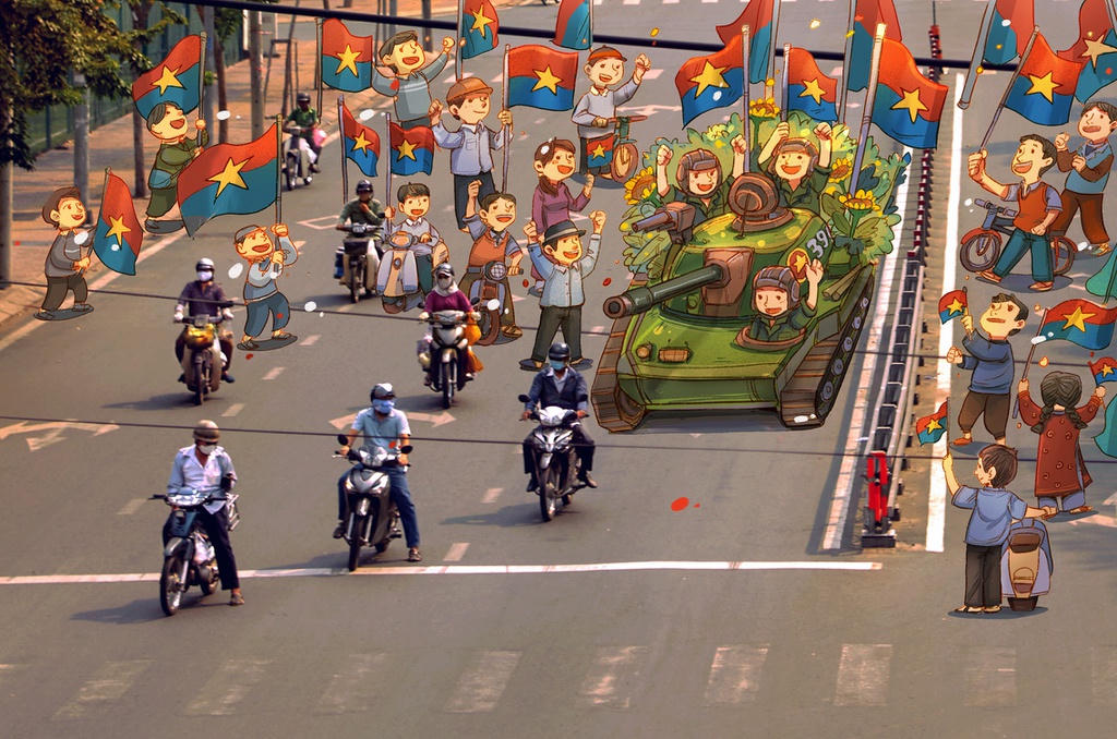 Dịp 30/4, một dự án nhỏ của các bạn trẻ đã khiến dư luận quan tâm. Đó chính là dự án “1 ngày và 45 năm” hướng về ngày 30/4 của nhóm bạn Thái Thanh (họa sĩ), Maxk Nguyễn (truyền thông, ý tưởng), Minh Mi Goi (nhiếp ảnh). Với 9 bức ảnh chụp các góc quen thuộc của TP, các bạn trẻ đã vẽ thêm vào đấy những hình ảnh của lịch sử, tái hiện chiến thắng hào hùng 30/4/1975. Mỗi người một việc, người thì đi chọn góc, thu thập ảnh, người thì chọn ảnh, vẽ thêm vào ảnh, người phụ trách truyền thông, giới thiệu bộ ảnh…