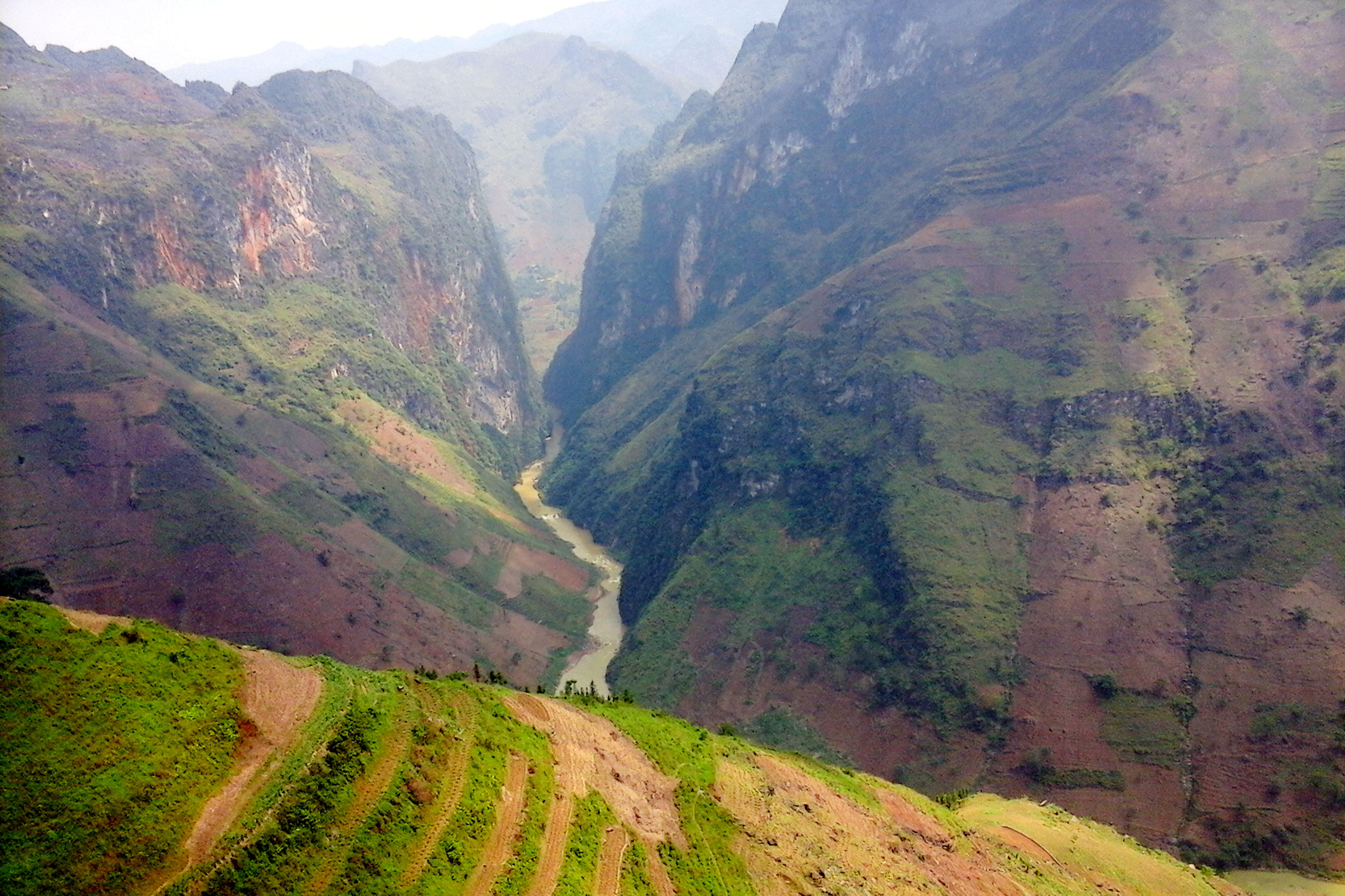 Từ trên đỉnh đèo nếu muốn xuống dòng sông Nho Quế thì sẽ mất một ngày trời. Tuy đường xa, nhưng du khách sẽ được trải nghiệm cùng những khoảnh khắc đẹp nhất hẻm vực. Vực sông này được ví như một trong những hẻm vực sâu nhất Đông Nam Á. Bên cạnh đó, dòng nước còn có màu xanh lam quện với màu xanh của núi rừng tạo nên một bức tranh thủy mặc, đầy mê hoặc làm say đắm lòng người.