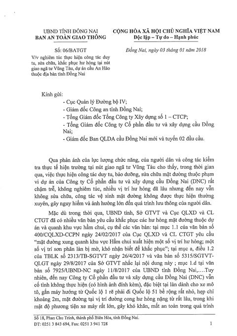 Theo Ban An toàn giao thông Đồng Nai, trong thời gian qua, các cơ quan chức năng và người dân phản ánh tình trạng mất an toàn giao thông tại nút giao thông ngã tư Vũng Tàu. Tại khu vực này, Công ty Cổ phần đầu tư xây dựng cầu Đồng Nai đã chậm trễ, thiếu nghiêm túc trong sửa chữa, duy tu bảo dưỡng mặt đường, gây nguy hiểm và ảnh hưởng đến quá trình lưu thông của người dân.