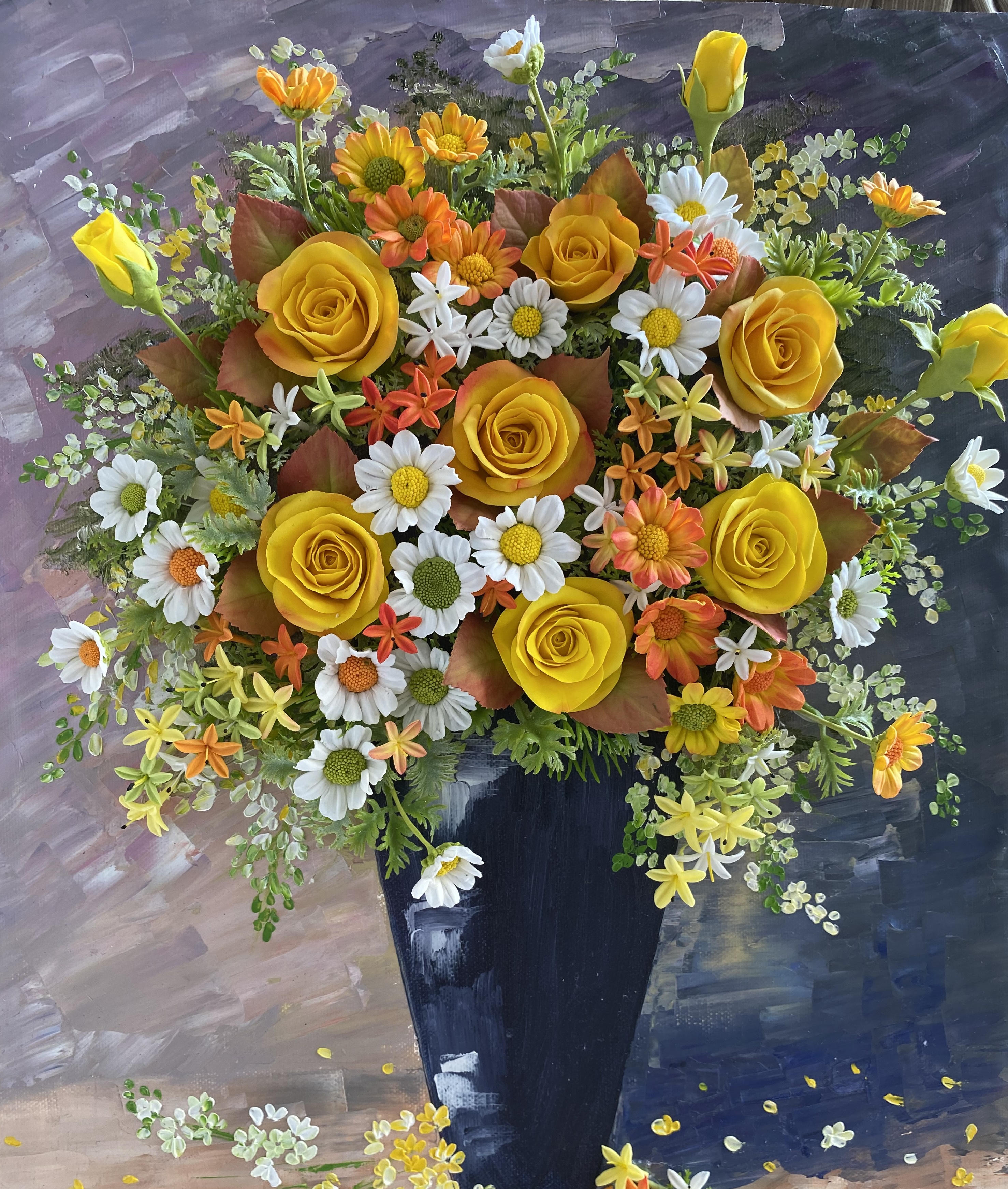Chị Sinh chia sẻ, thật ra từ năm 2016 chị đã học một lớp làm hoa bằng đất sét trong 1 tháng. Và loại hình làm hoa này đã xuất hiện một thời gian dài trước đây, tại Việt Nam cũng đã có nhiều người làm. Bẵng đi thời gian, đến năm ngoái chị Sinh mới nghĩ đến việc thử kết hợp hoa đất sét và tranh vẽ.