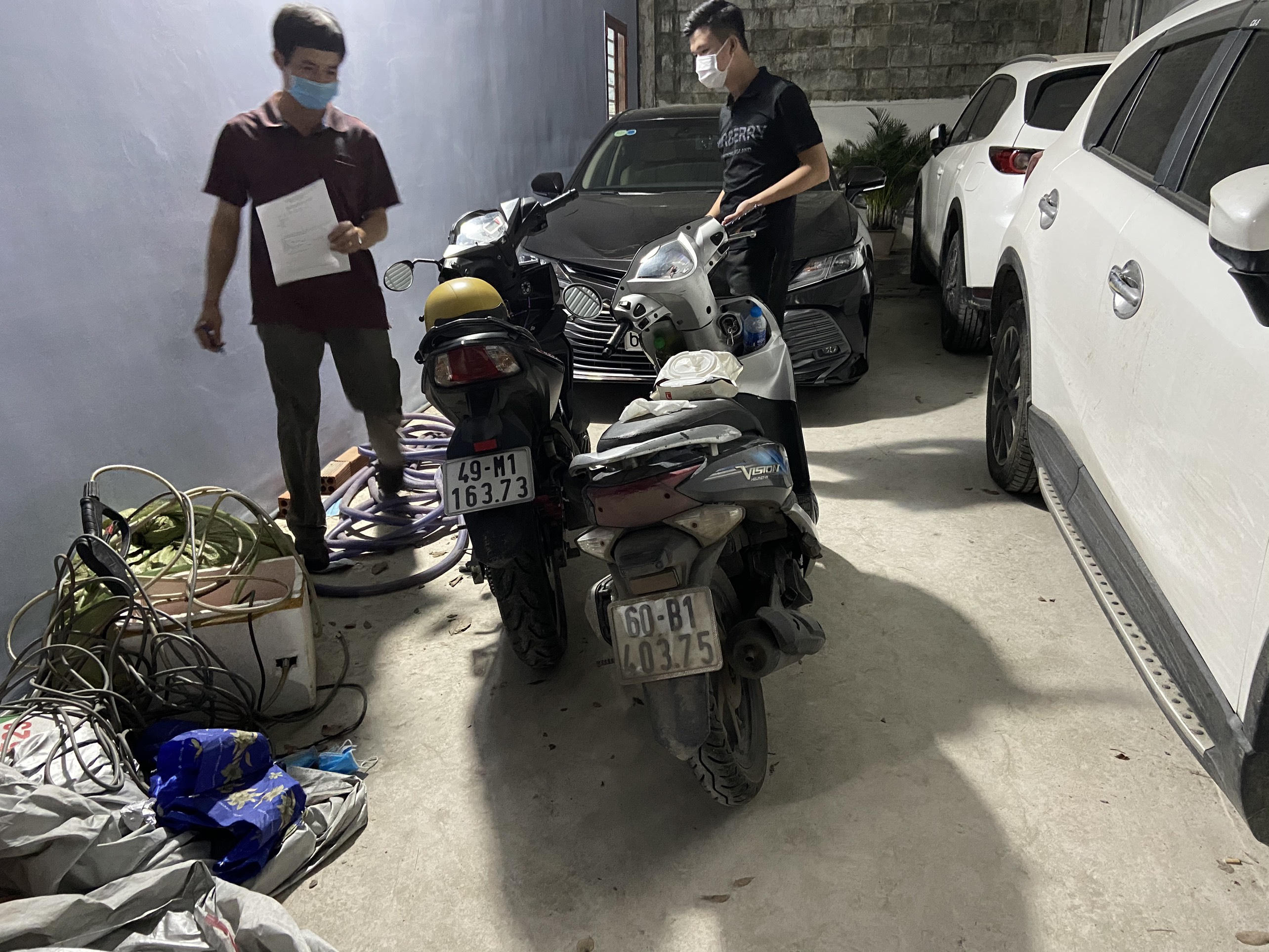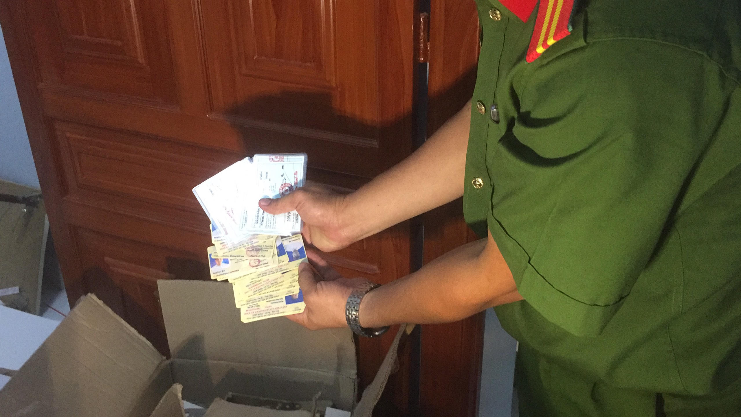 Tại hiện trường, cơ quan công an thu giữ hàng loạt giấy tờ, tài liệu giả gồm: Thẻ nhà báo, giấy chứng minh nhân dân, thẻ căn cước, giấy chứng nhận quyền sử dụng đất (sổ đỏ), giấy đăng kiểm ô tô, biển số xe. Ngoài ra, cơ quan chức năng tạm giữ 3 ô tô và nhiều phượng tiện, máy móc, thiết bị phục vụ cho việc làm giả các loại giấy tờ, tài liệu.