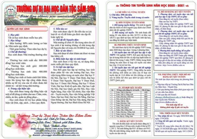 Năm học 2020 - 2021 trường Dự bị Đại học Dân tộc Sầm Sơn tuyển sinh 590 chỉ tiêu trong cả nước.