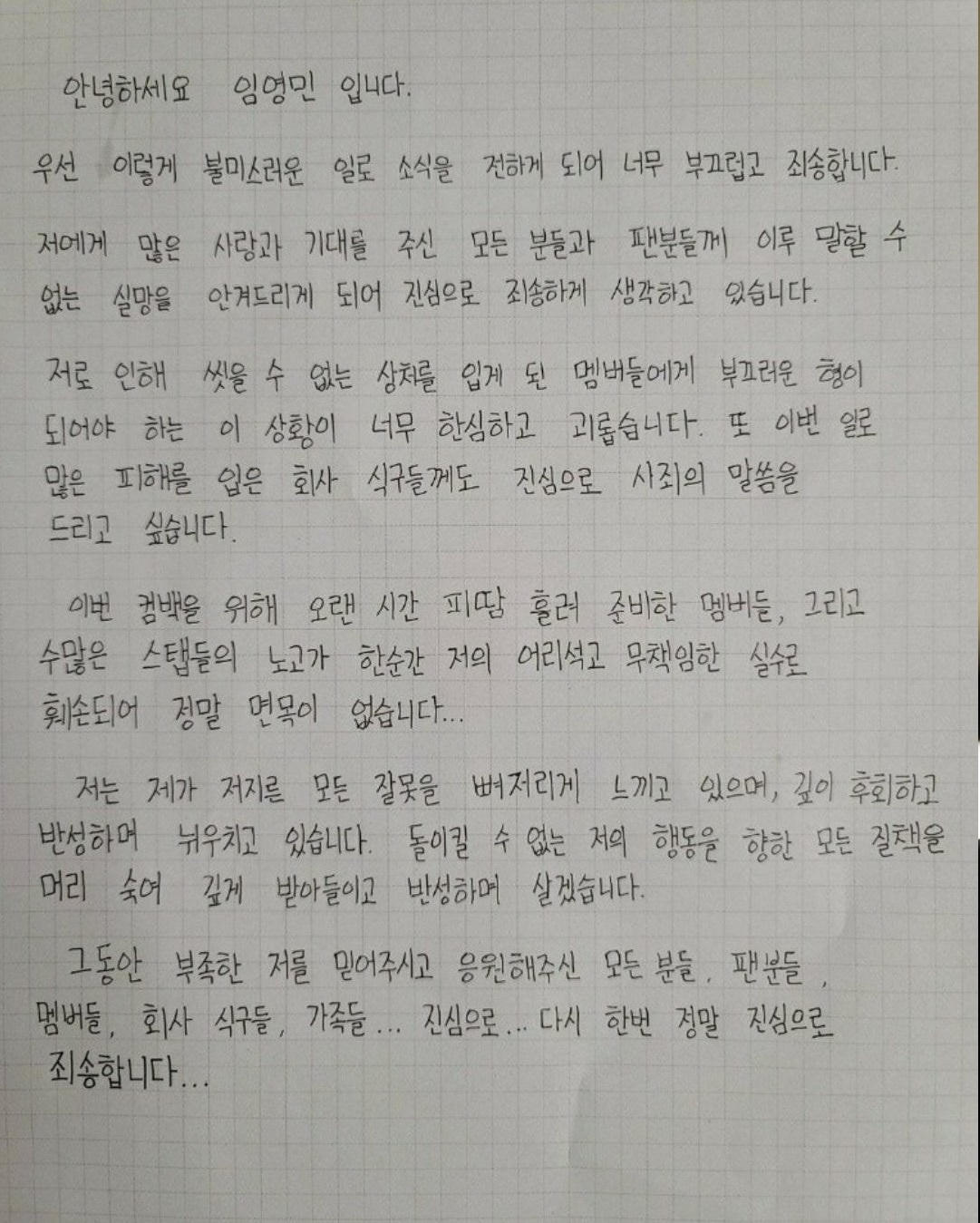Chúng tôi xin được bày tỏ lời xin lỗi sâu sắc tới mọi người đã tham gia vào quá trình quảng bá album vì tình cảnh của nhóm lúc này “.