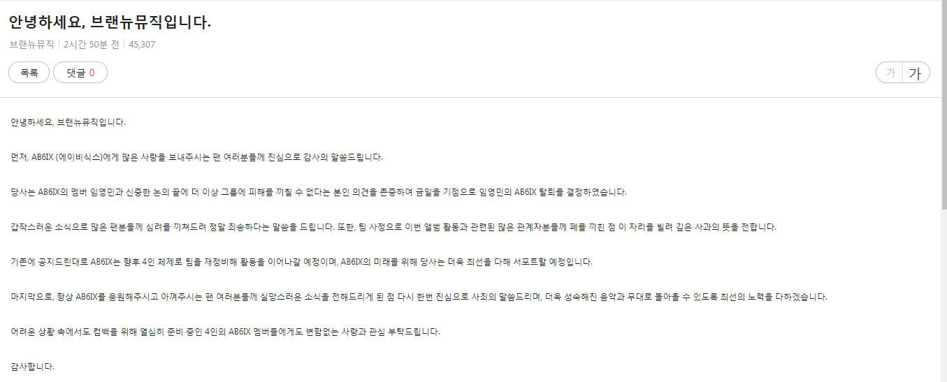 Trong nội dung được đăng tải, công ty cho biết: “Sau quá trình thảo luận kỹ lưỡng với thành viên của AB6IX Im Young Min, việc rời nhóm của cậu ấy được quyết định trong hôm nay (8/6).