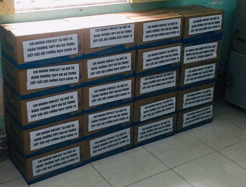 Thấu hiểu những vất vả, hy sinh của đội ngũ y bác sỹ, các lực lượng tham gia phòng chống dịch Covid – 19, Đoàn trường THPT Hai Bà Trưng cùng với đại diện xe máy điện Vinfast tại TP Huế đã trao 30 thùng nước uống đóng chai cho Trung tâm Kiểm soát bệnh tật Thừa Thiên Huế, nhằm chung tay, góp sức trong công tác phòng, chống đại dịch này.