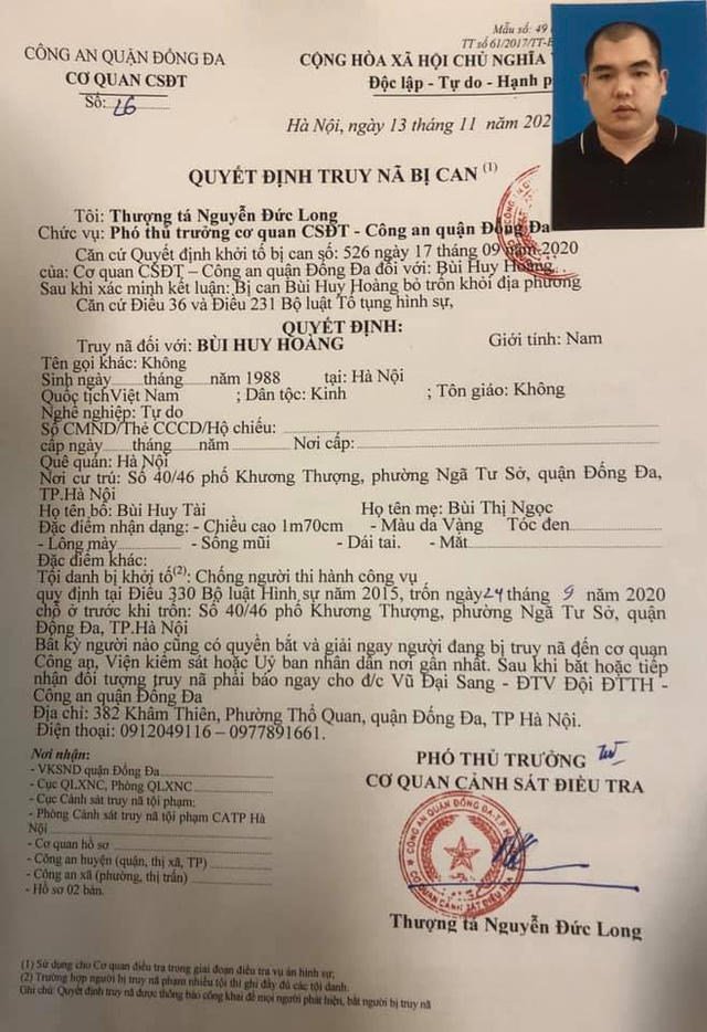 Tuy nhiên, đối tượng đã bỏ trốn khỏi nơi cư trú. Ngày 13/11/2020, Cơ quan CSĐT Công an quận Đống Đa đã ra Quyết định truy nã bị can đối với Bùi Huy Hoàng.